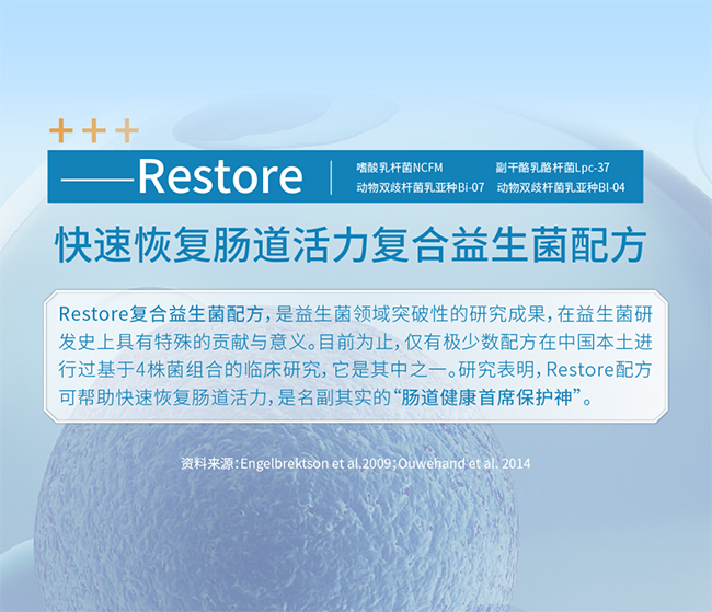 同時,通過試驗發現,Restore復合益生菌配方(由嗜酸乳桿菌NCFM+副干酪乳酪桿菌Lpc-37+動物雙歧桿菌乳亞種Bi-07+動物雙歧桿菌乳亞種Bl-04組成)能幫助改善四聯治療的副作用,顯著降低抗生素相關性腹瀉(AAD)的發生率,縮短腹瀉的持續時間,緩解抗生素藥物導致的腸道不適(如腹痛、腹脹等)。