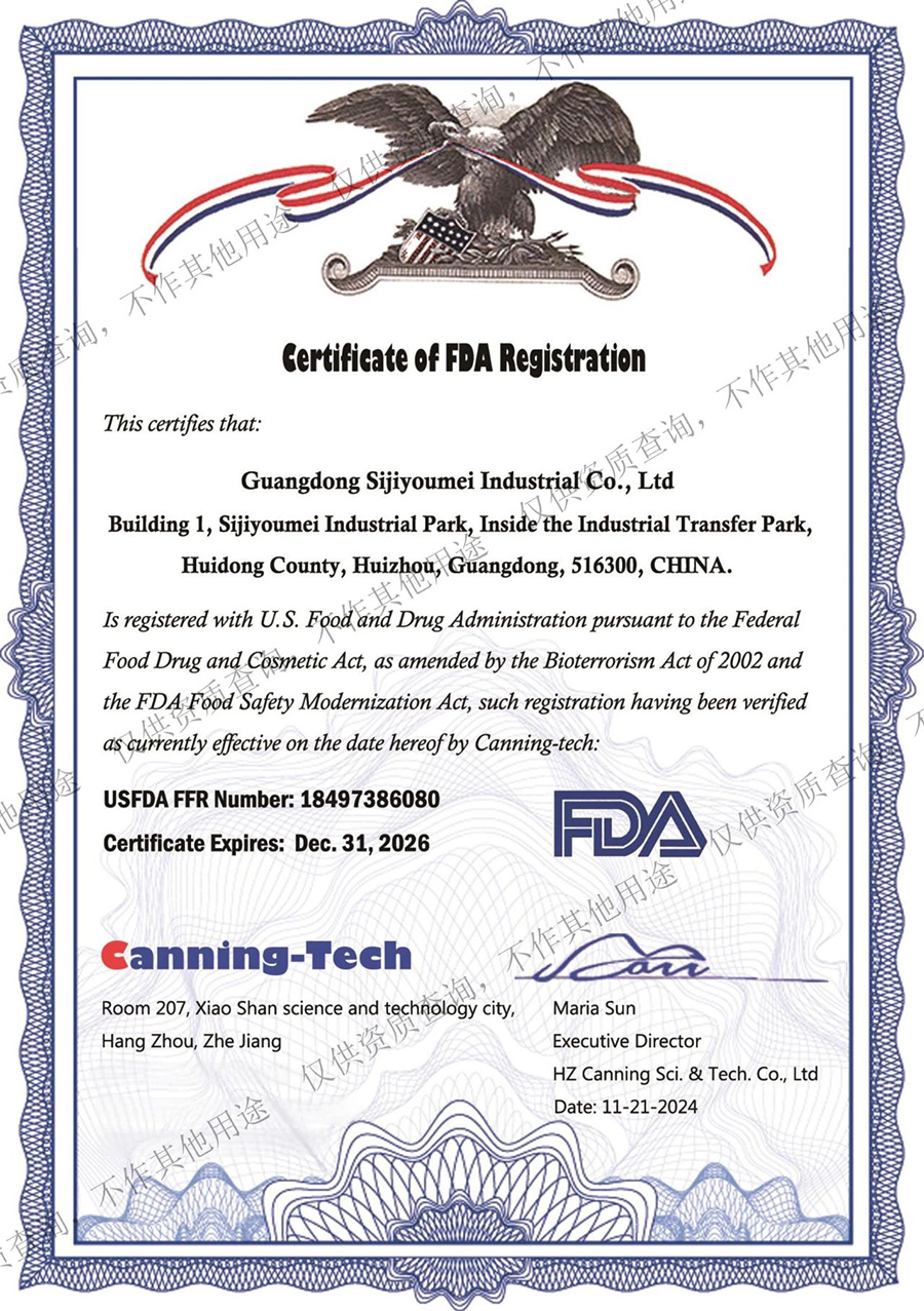 近日,廣東四季優(yōu)美實業(yè)有限公司(以下簡稱“四季優(yōu)美”)已順利完成在美國食品藥品管理局(FDA)的注冊更新程序,注冊號:18497386080。此次注冊更新,涵蓋了公司目前在售的所有產(chǎn)品類別,包括固體飲料、咖啡、水果及其制品、果凍等,標志著四季優(yōu)美在國際市場的品質(zhì)管理和食品安全標準上又邁出了堅實一步。